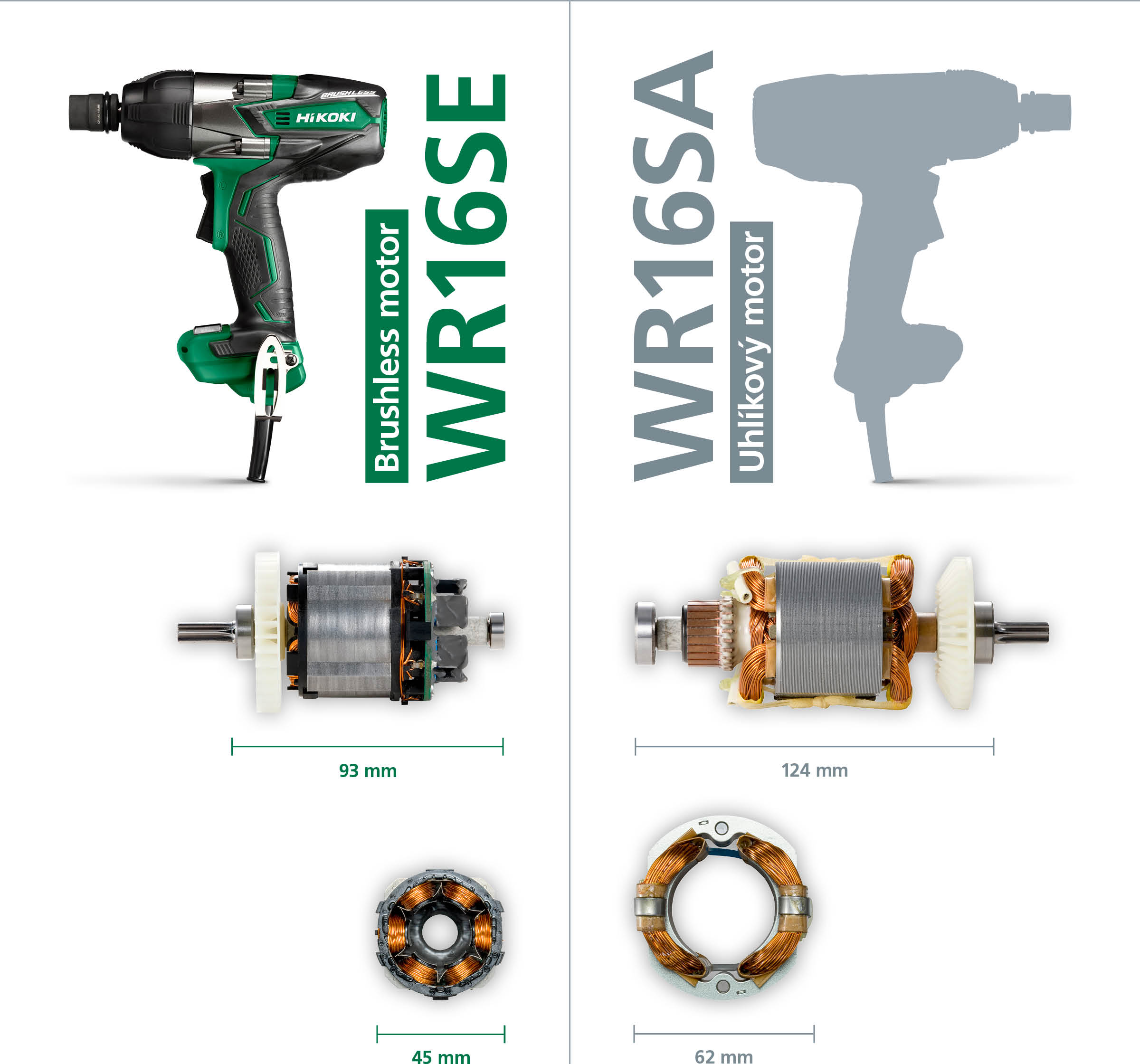 Pokud například porovnáte motor bezuhlíkového nárazového klíče WR16SE s uhlíkovým nárazovým klíčem WR16SA, je o 31 milimetrů kratší a o 340 gramů lehčí!