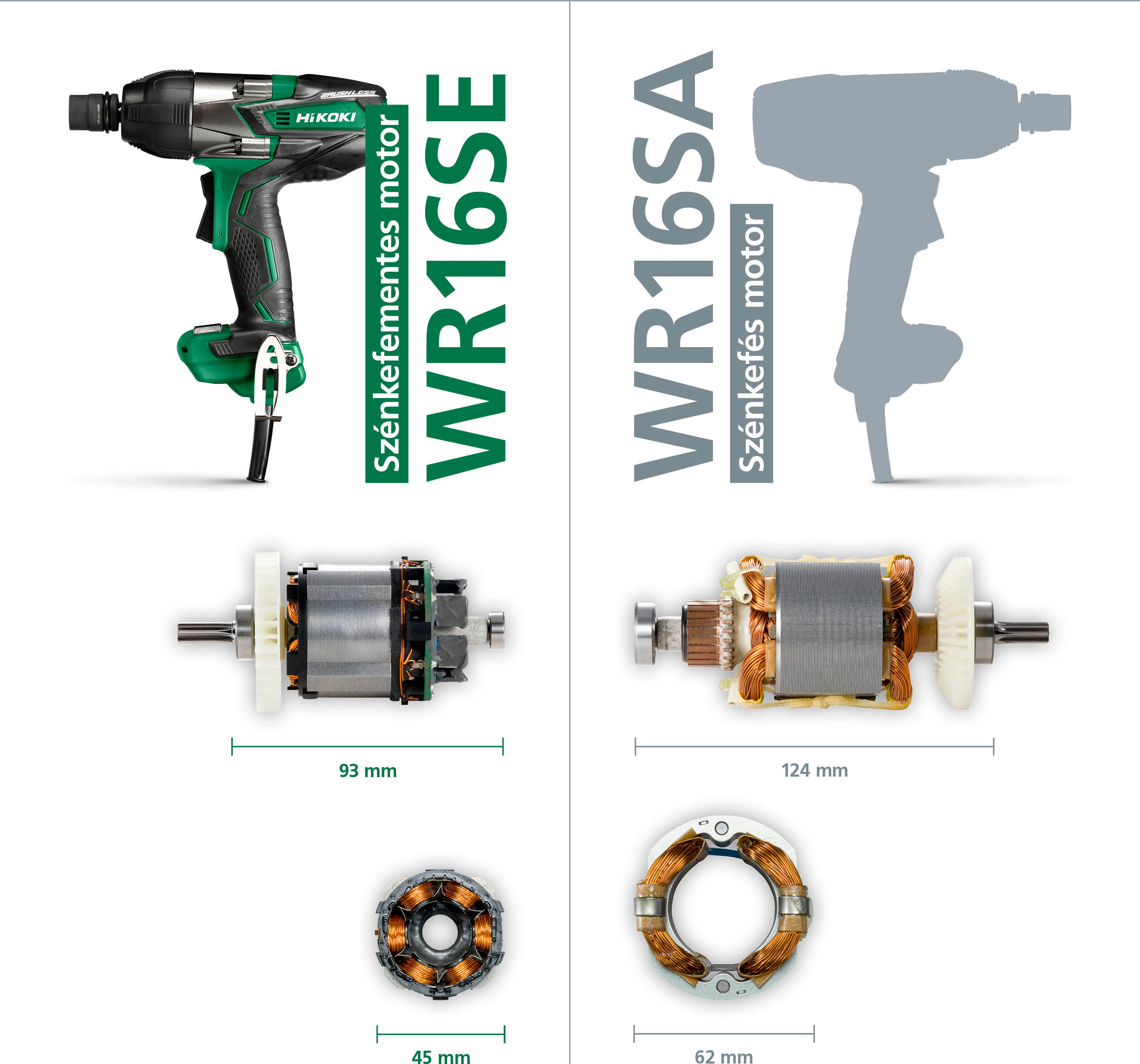 Például, ha összehasonlítjuk a WR16SE szénkefe nélküli ütvecsavarozó és a szénkefével ellátott WR16SA ütvecsavarozó motorját, akkor azt látjuk, hogy az előbbi 31 mm-rel rövidebb és 340 g-mal könnyebb!