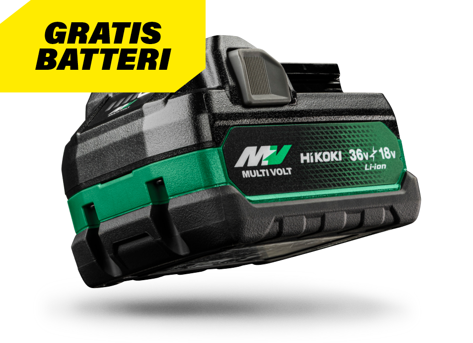 * Kampanjetilbudet gjelder utvalgte HiKOKI elverktøy ("Kampanjeprodukter") som er kjøpt og registrert innenfor kampanjeperioden 01.10.2025 t.o.m. 31.03.2026. Du vil motta et MULTI VOLT BSL36A18X batteri kostnadsfritt - så langt lageret rekker.