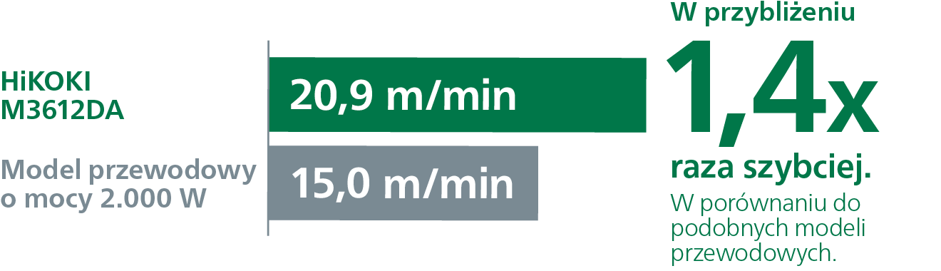 Dzięki połączeniu technologii MULTI VOLT i technologii Brushless Motor model M3612DA jest niewiarygodnie mocny i stanowi doskonałe rozwiązanie akumulatorowe. Model ten poradzi sobie nawet z dużym obciążeniem, a prędkość skrawania jest jeszcze wyższa niż w podobnych modelach przewodowych.